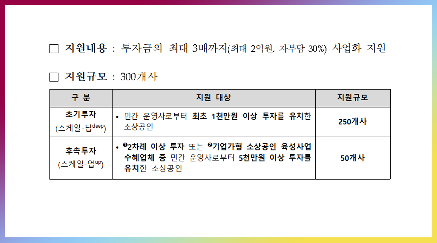 지원 대상은 소상공인시장진흥공단에서 지정한 민간 운영사로부터 투자받은 소상공인이 신청할 수 있습니다.