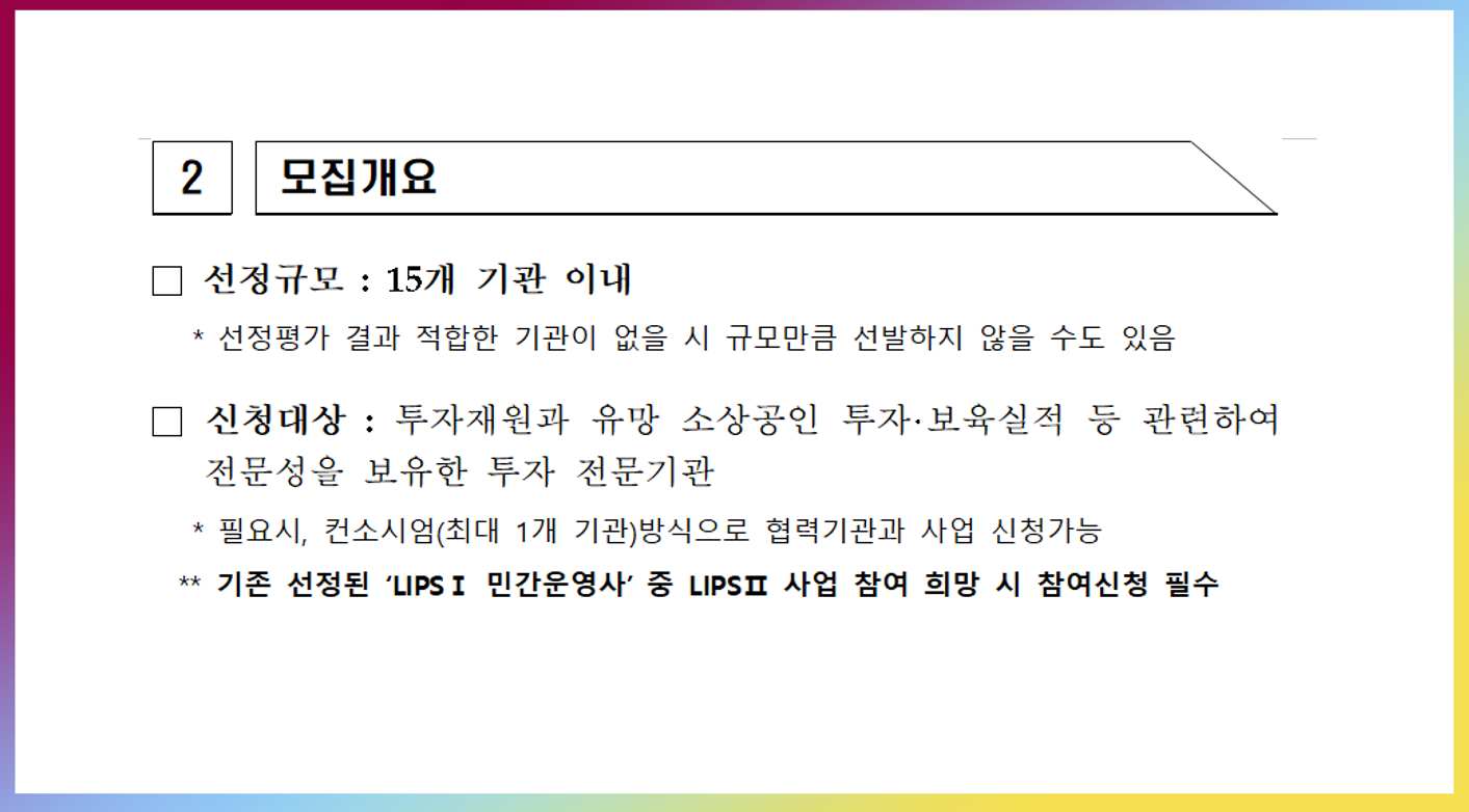 중기부에서 립스 2 사업을 위해 사전 빌드업을 진행했었는데요, 우선 민간 운영사를 새롭게 추가로 뽑았고요....(아래 공고문 참조)