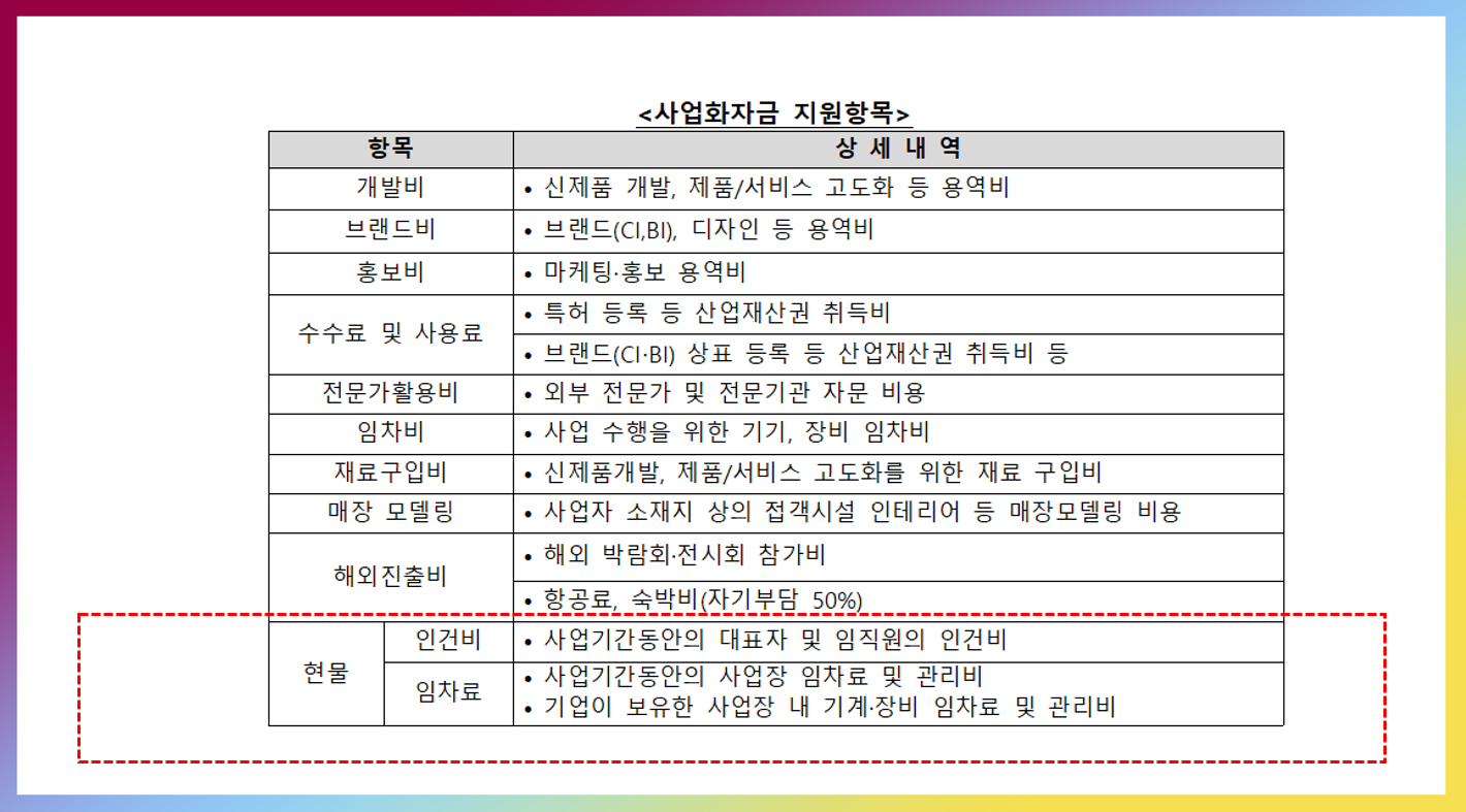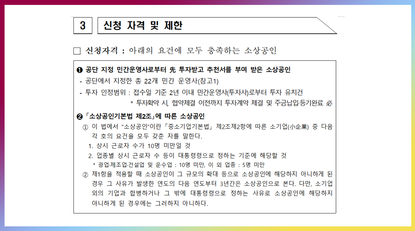 신청 제한 사항으로는 당해 연도 기업가형 소상공인 육성사업(강한 소상공인성장지원 등), 중기부 및 타부처 사업화 지원사업에 선정된 경우는 신청이 불가합니다. 또한 테크 기반 스타트업이거나 팁스 선정 기업들은 제한될 수 있다고 하네요.