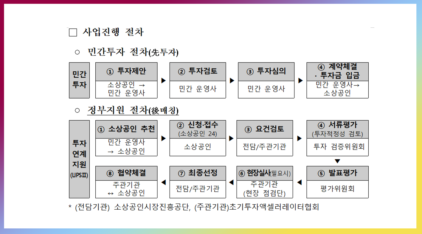 아래 절차를 보시면 우선 운영사로부터 투자를 받으신 후 사업계획서를 소상공인시장진홍공단에 제출해서 평가를 받습니다.