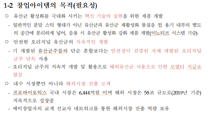 창업자 분들의 아이템이 위의 카테고리에서 어디에 해당될 수 있을까요? 잘 고민해 보시고 한번 적어 보세요. 저의 유산균 아이템으로 적어 본 내용은 다음과 같고, 빨간색으로 구현하고 싶은 내용을 강조했습니다. 다시 한번 강조합니다. 파란색 유의사항을 빠뜨리면 탈락입니다 ^^