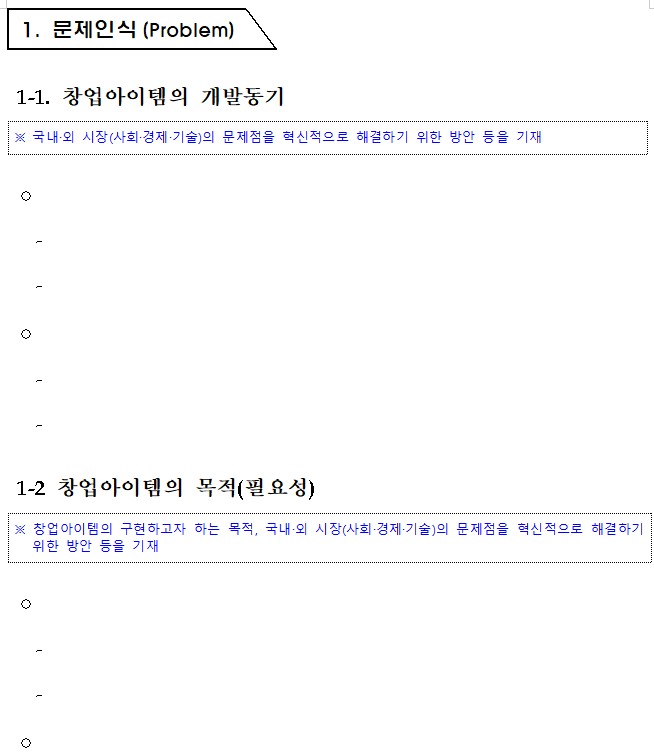 이전 글에서 국내외 시장(사회, 경제, 기술)의 문제점 관련 내용은 작성법을 설명드렸으니, 지금부터는 창업 아이템의 구현하고자 하는 목적 파트를 어떻게 적을 것인가에 대해 설명드리겠습니다.