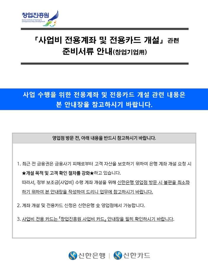 아래는 사업비 전용 계좌 및 전용 카드 개설 안내문 표지입니다.