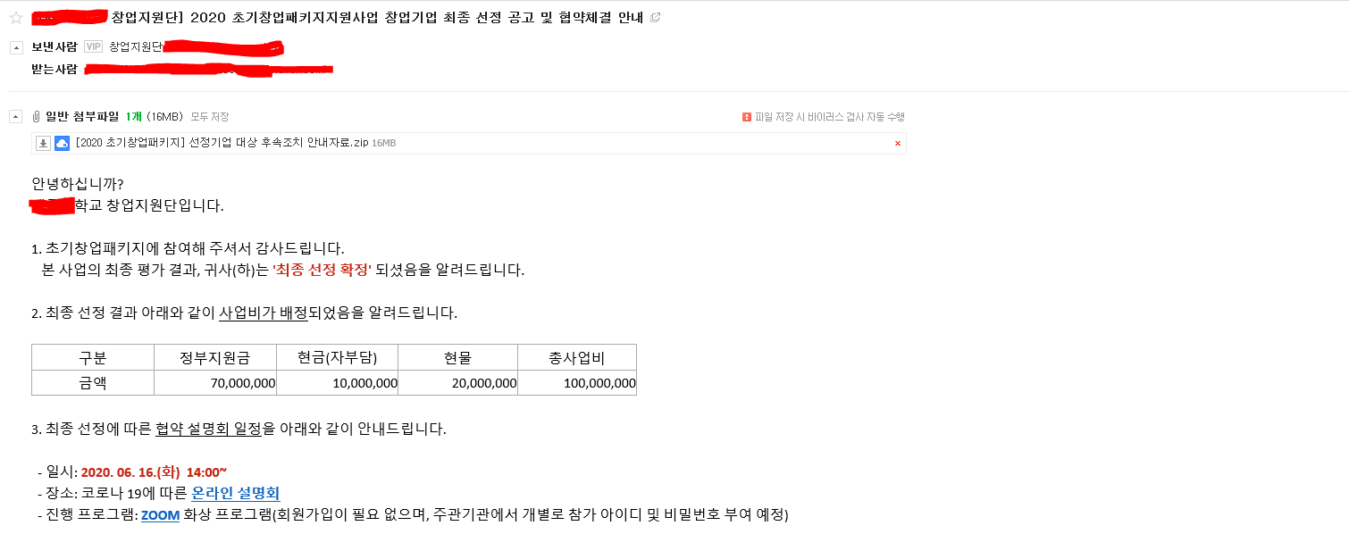 우선 아래와 같이 주관기관인 ??대학교 창업지원단으로부터 최종 선정 확정 메일과 최종 사업비 조정 결과를 안내받았습니다.